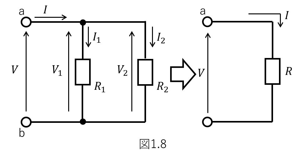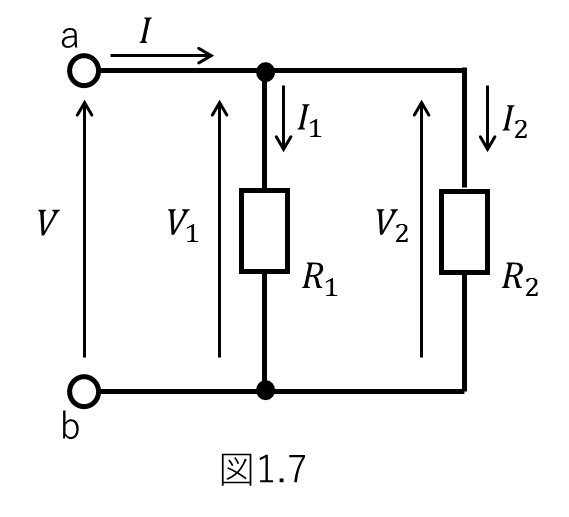 下図1.7を参照ください。抵抗\(R_1\)に流れる電流を\(I_1\)、抵抗\(R_2\)に流れる電流を\(I_2\)とします。また、抵抗\(R_1\)の両端に生じる電位差を\(V_1\)、抵抗\(R_2\)の両端に生じる電位差を\(V_2\)とすれば、