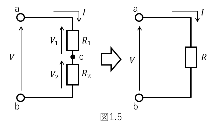 これら2つの抵抗によって生じるトータルの電位差\(V\)はa端-b端間に生じる電位差\(V\)です。これがいくつになるかと言えば、\(V_1\)と\(V_2\)の和になります。