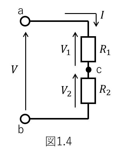 ところで、トータルの電位差は\(V_1+V_2\)ですが、抵抗\(R_1\)と抵抗\(R_2\)の間のc点とb点の電位差は\(V_2\)です。\(V_1\)分だけ小さくなってます。これは抵抗\(R_1\)によって\(V_1\)だけ電圧が下げられたという見方もできます。
