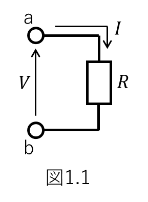このとき、四角形で示す素子の両端 (a-b間) に生じる電位差\(V\)と電流\(I\)の間には以下の式で示すような関係があります。