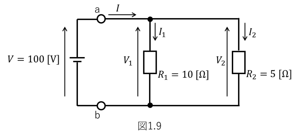 図1.9に示す回路において、\(100 \mathrm{[V]}\)の直流電源を接続したとき抵抗\(R_1\)に流れる電流\(I_1\)、抵抗\(R_2\)に流れる電流\(I_2\)および電流の合計値\(I\)を求めよ。