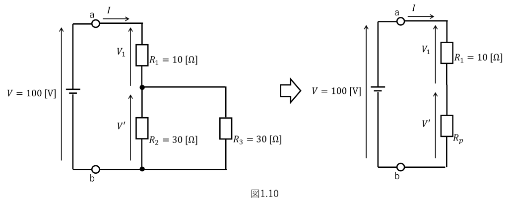 となり、また抵抗\(R_2\)および\(R_3\)の両端の電位差\(V’\)は電源の電圧\(V\)と抵抗\(R_1\)の両端の電位差(抵抗\(R_1\)の電圧降下\(V_1\))から、